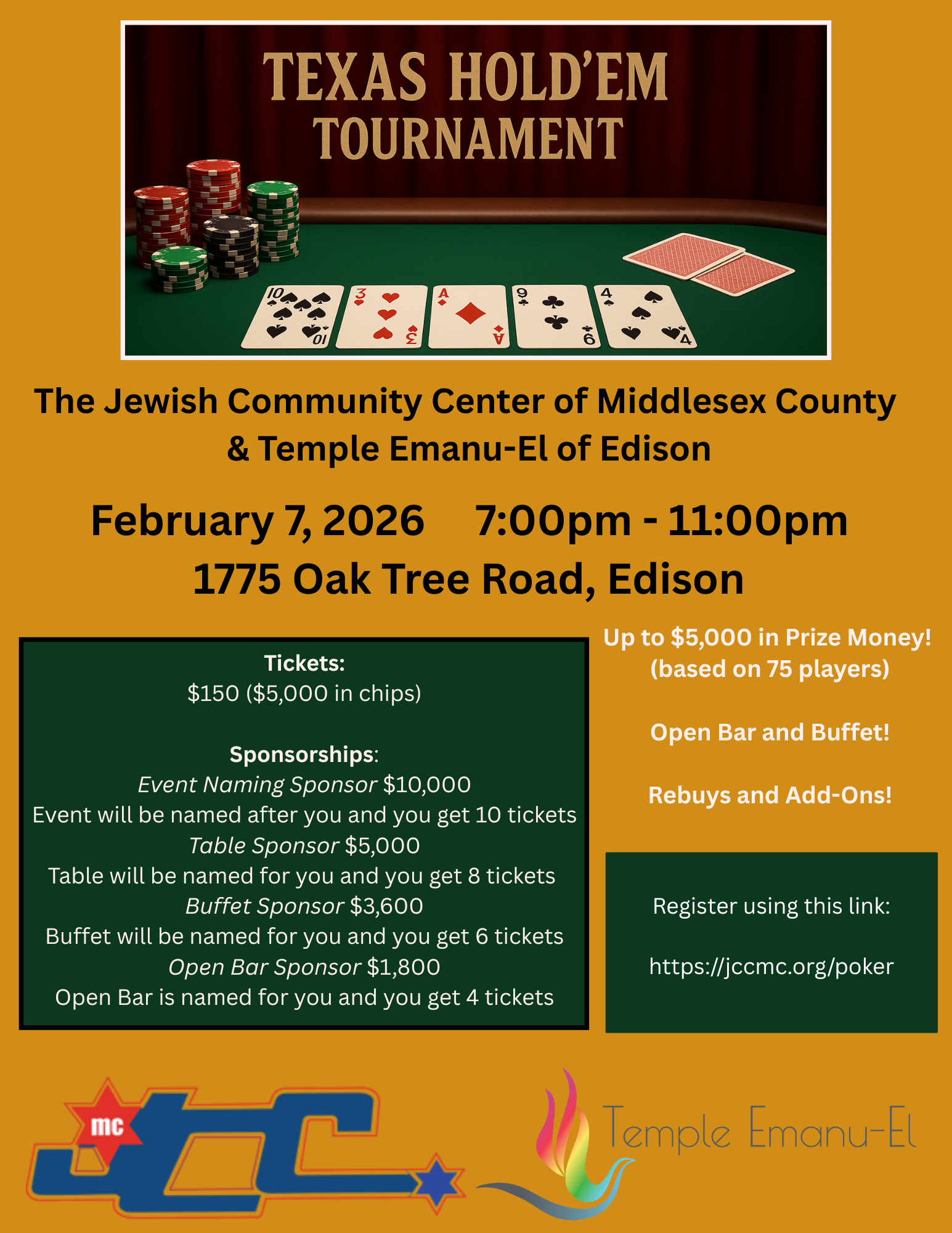 Join the JCC and Temple Emanu-El for our first ever Texas Hold'em Tournament!