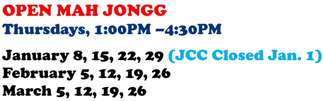 Mah Jongg: Tuesdays at 3PM & Thursdays at 1PM. Open to Members Only for fun and camaraderie. New players are always welcome! FREE and Open to Community Campus Members Only.