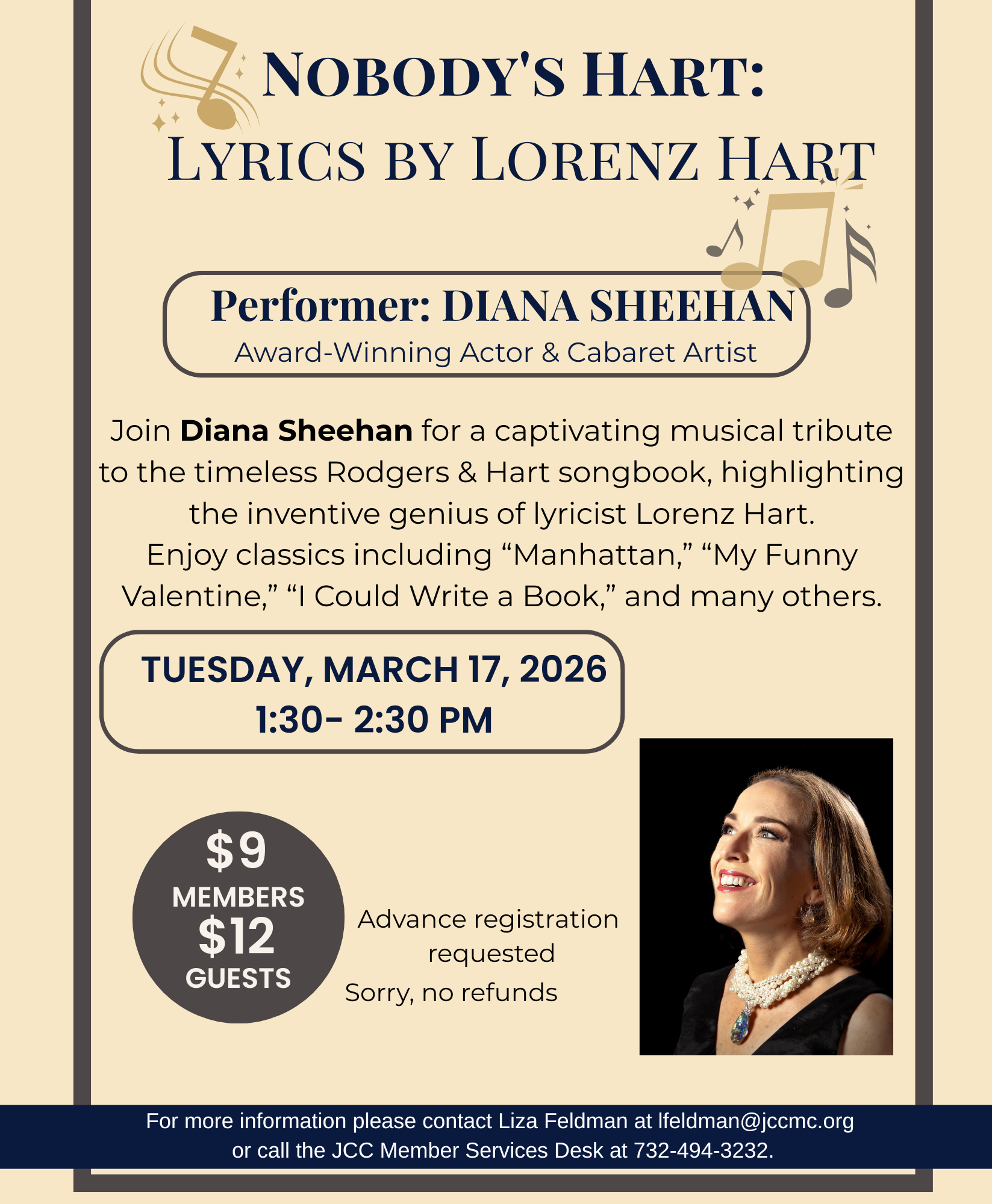 Join Diana Sheehan for a captivating musical tribute to the timeless Rodgers & Hart songbook, highlighting the inventive genius of lyricist Lorenz Hart. Enjoy classics including “Manhattan,” “My Funny Valentine,” “I Could Write a Book,” and many others.