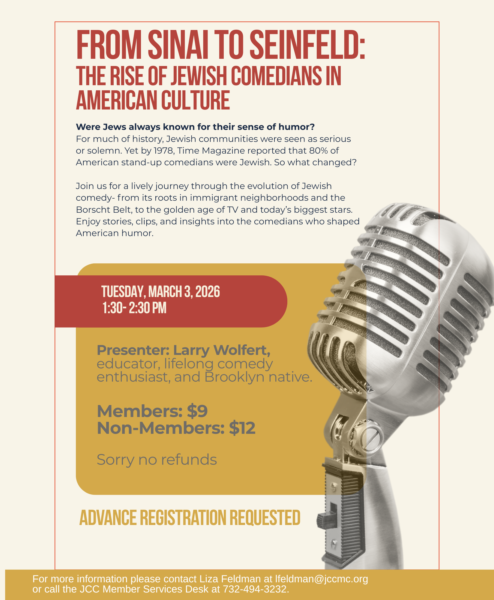 TO REGISTER: Call the JCC Front Desk at 732-494-3232 or email Liza Feldman at lfeldman@jccmc.org. To register online please click HERE. Sorry, no refunds.